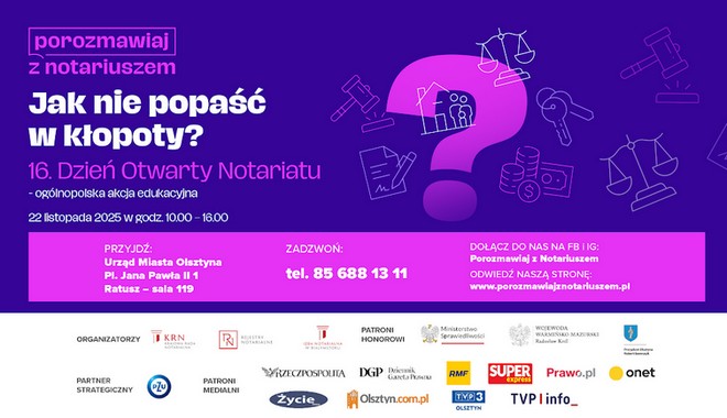 W sobotę 22 listopada 2025 r., w godzinach 10:00 – 16:00, notariusze w całej Polsce zapraszają na 16. edycję Dnia Otwartego Notariatu – ogólnopolskiej akcji edukacyjnej, podczas której każdy może uzyskać bezpłatną informację prawną u notariusza.