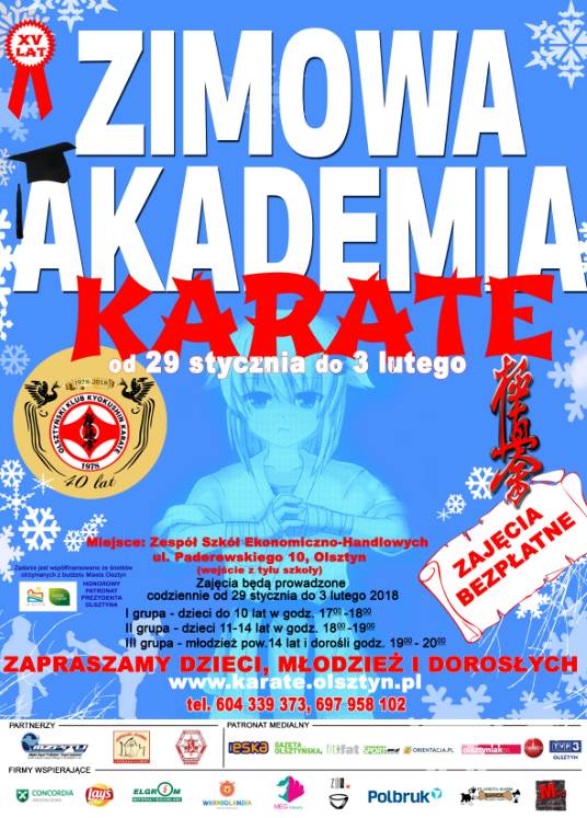 Olsztyński Klub Kyokushin Karate informuje, iż po raz 15 organizuje Zimową Akademię Karate. Nieodpłatne zajęcia sportowe skierowanie do dzieci i młodzieży z Olsztyna.